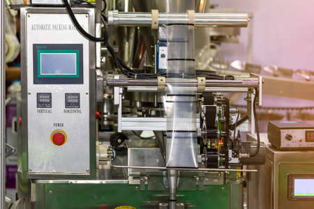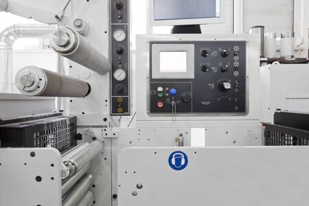 Modern industrial equipment with control panel on the foreground. Selective focus.