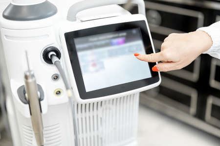 Cosmetologist near laser treatment device in beauty clinic