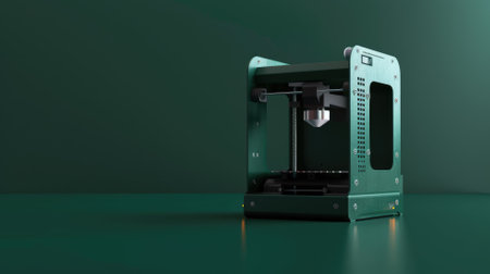 Green 3D printer on table with dark background
