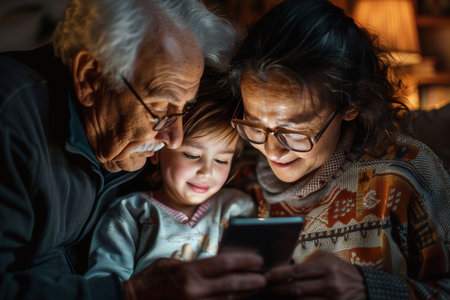 Grandchildren And Grandparents Using Digital Tablet And Mobile Phone At Home