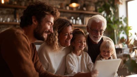 Family enjoys time together while looking at a tablet in a cozy cafe setting