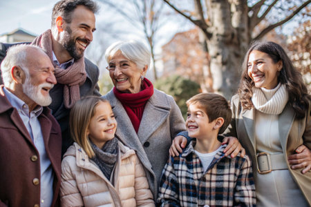 happy family with three generations of men and women spending time together in autumn park
