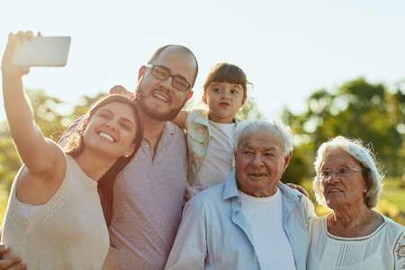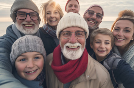 Group of people smiling and taking selfie with older man and woman in joyful family gathering moment