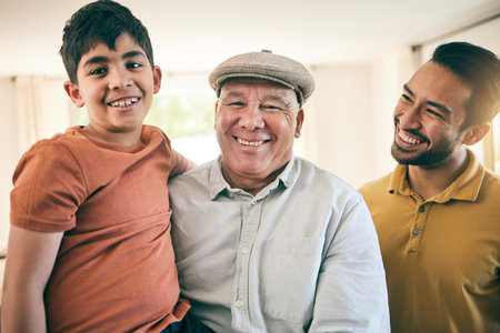 Portrait of child, father and grandfather at home with happiness, proud smile and fun. Boy kid, senior man and parent relax together as male family with love, care and joy in a living room for visit