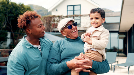 Delighted cute boy hugging his father and grangfather. Grandfather father and son are hugging and having fun together.