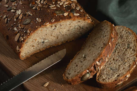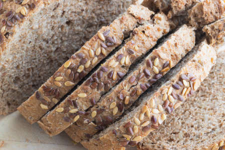Multi grain sourdough bread with flax seeds cut on a wooden board, closeup view. Healthy vegan bread choice