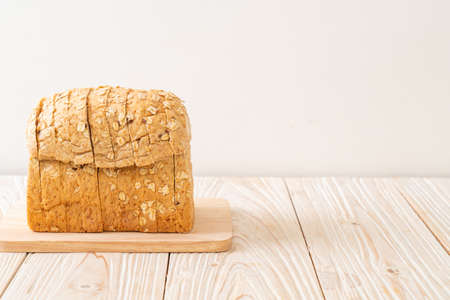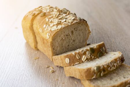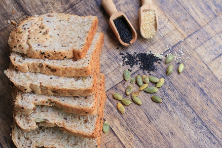 Super grains sliced bread. Health food to reduce high blood pressure, cholesterol and healthy heart. Health food concept with super foods. Top view.