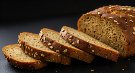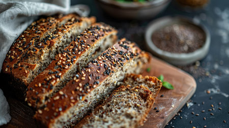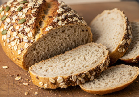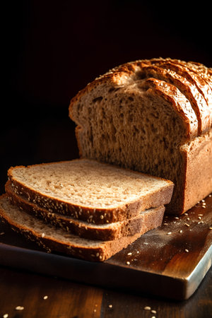 Discover the rustic charm of freshly baked whole grain bread slices, perfect for adding warmth and flavor to any meal or setting.