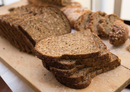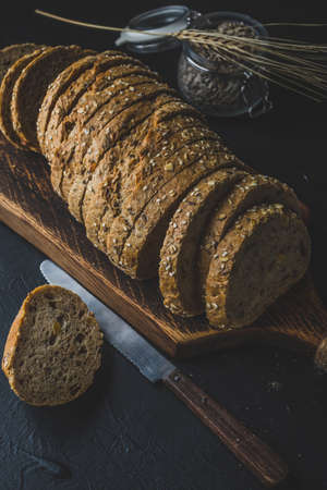 Freshly baked whole grain French loaf cut in slices on chopping board. Closeup shot. Traditional bread or baker job concept