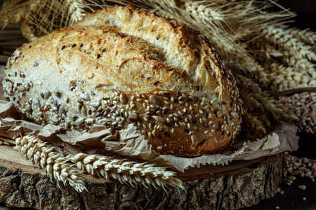 Fragrant black bread with spices, grains and ears of wheat on a wooden vintage surface