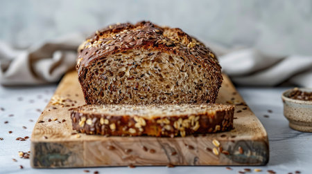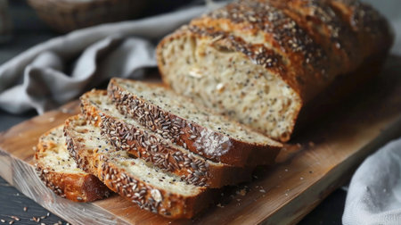 Multi grain sourdough bread with flax seeds cut on a wooden board, closeup view. Healthy vegan bread choice --ar 16:9 --v 6 Job ID: 237e17c8-a074-486c-afa0-76274f55f2bf