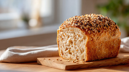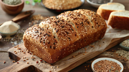 Scrumptious whole grain loaf, baked to perfection, showcased on a wooden board, embellished with an assortment of wholesome seeds for added flavor and texture
