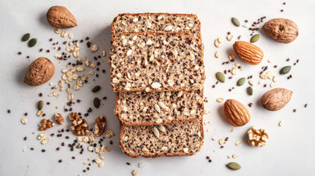 Sliced multigrain bread on a clean surface, highlighting the seeds and grains embedded in each slice