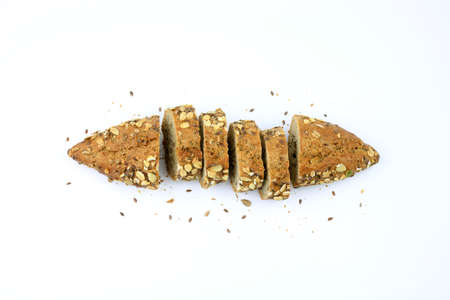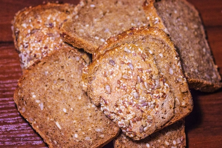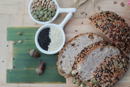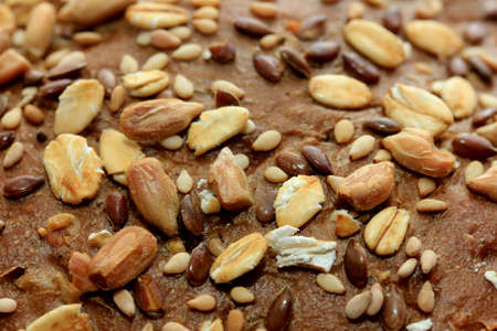 Bread from wholemeal flour and seeds sunflower, flax, sesame. Creative food idea, background texture
