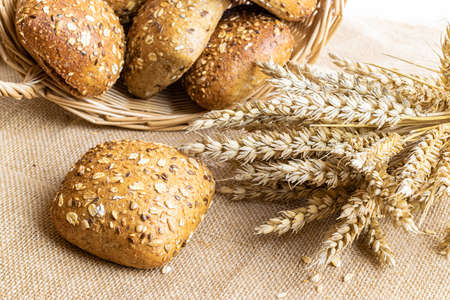 Multi-grain bread rolls and cereal ears on on blue wooden table. Healthy diet.