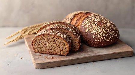 Freshly sliced whole grain bread arranged on a rustic wooden cutting board captures the essence of healthy eating. Perfect for meal preparation or casual dining.