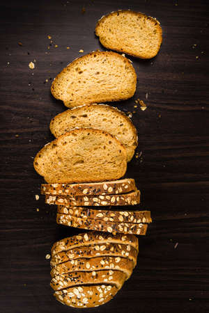 bread concept many slices of the whole wheat bread with seeds arranged into a line in the middle on the black background.