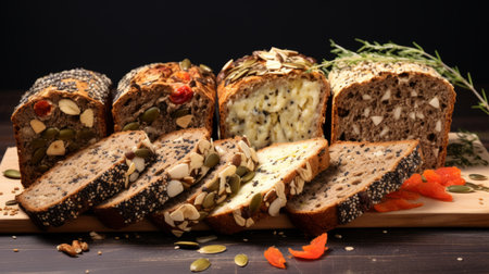 Assortment of diet breads including seed loaf on neutral background, AI generated