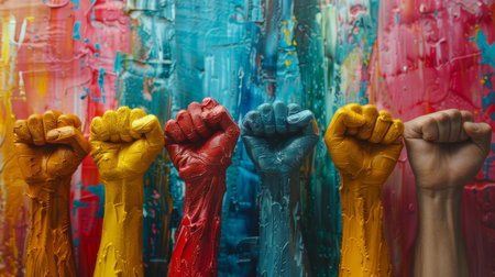 Five vibrant painted hands raised in fists symbolize unity, strength, and diversity, set against an abstract colorful background.