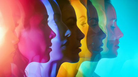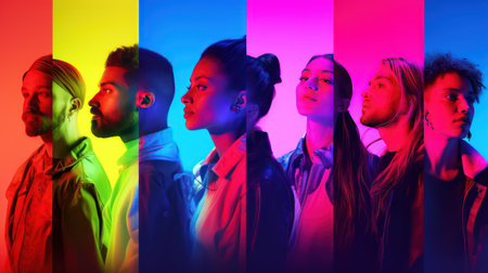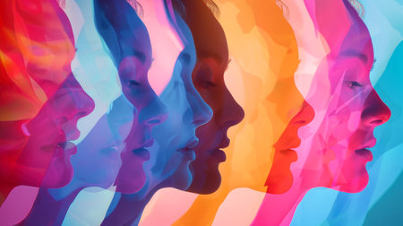 A vibrant group of diverse silhouettes, each one a different color, standing together in harmony against a colorful background.