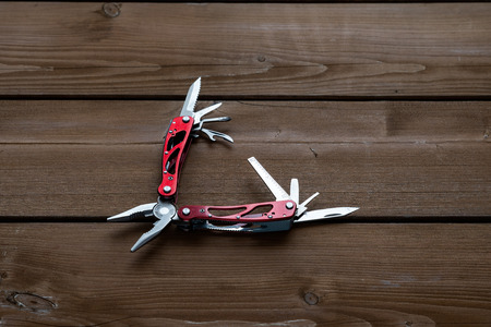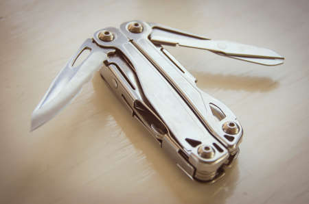 Multifunctional knife on a wooden table and white background