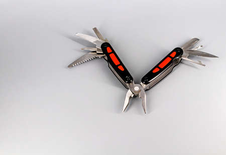 Multipurpose Tool - Multipurpose pliers, knife, screwdriver, hook, saw on a neutral background - Isolated