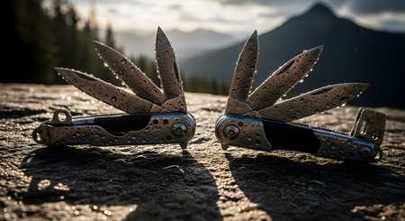 Two identical, metallic multi-tools, covered in water droplets, sit open on a rock with a beautiful mountain landscape in the background. The various blades and tools are fanned out, showcasing their versatility and preparedness for outdoor adventures. The image is a rugged and appealing product-style shot for outdoor gear.