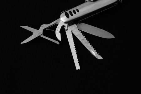 Close up photo of swiss army knife on black