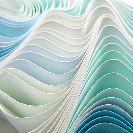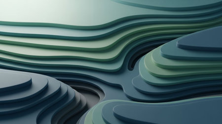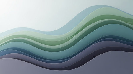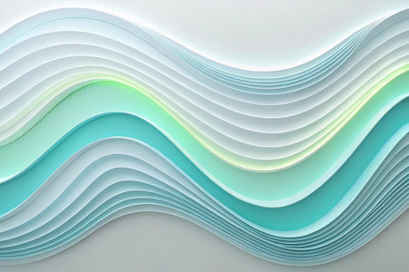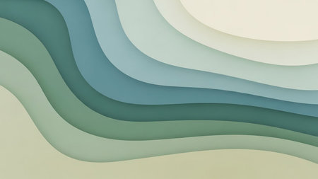 Gentle wavy layers in soft pastel greens and blues create a serene abstract background with a paper-cut effect and subtle shadow depth.
