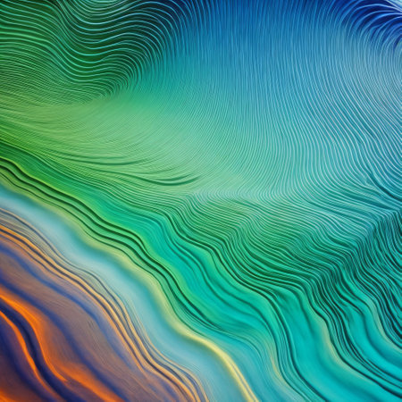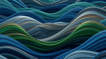Abstract showing abstract flowing waves of blue green and gold with smooth glossy texture and soft light creating a...