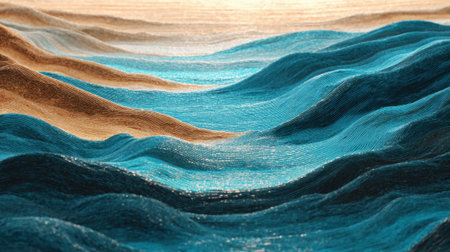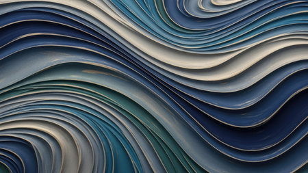 An intricate design illustrates ocean waves' movement, featuring rich shades of blue and brown. The artwork captures the allure of water and its calming nature, creating a serene visual experience.