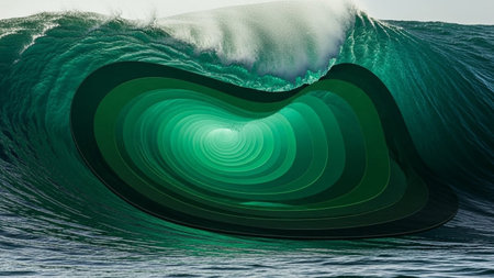 An abstract, surreal depiction of a powerful green ocean wave with concentric, layered inner shapes.