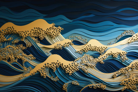 Waves of flowing colour from gold and blue tones in an asian paper style created with generative AI technology