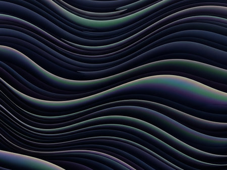 A dark, abstract background featuring smooth, iridescent wavy lines that exhibit subtle shifts in color, creating a mesmerizing visual texture.