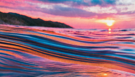 Waves gently ripple across the foreground as the sunset sky blazes with pink and blue hues above a distant shoreline.. AI Generation
