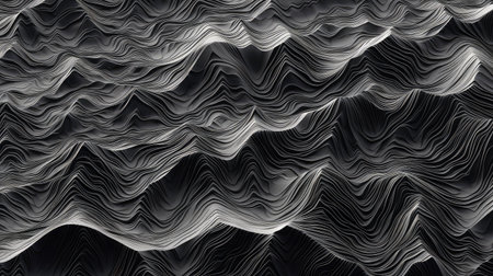 The image shows an abstract design of flowing, wavelike forms in black and white with a sense of movement and grace. geometric black and white forms flowing waves in background.