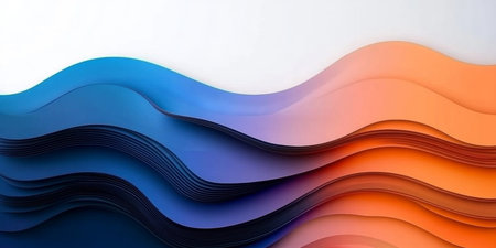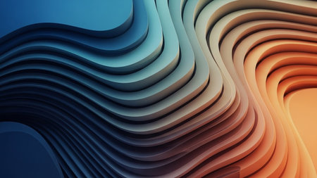 Abstract showing abstract wavy layers of blue and orange gradient with smooth curves and soft shadows creating...