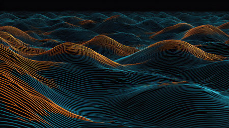 An abstract depiction showcases a landscape formed by repeating lines in shades of teal and orange. The image depicts rolling hills or waves, creating a textured visual effect. The composition could be useful in design projects needing a modern, data-driven, or artistic aesthetic. The style could be employed in various commercial applications.