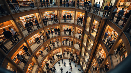Gazing down into a unique architectural marvel, the spiral library captivates visitors immersed in reading. Shelves overflow with books, while people explore the serene atmosphere.