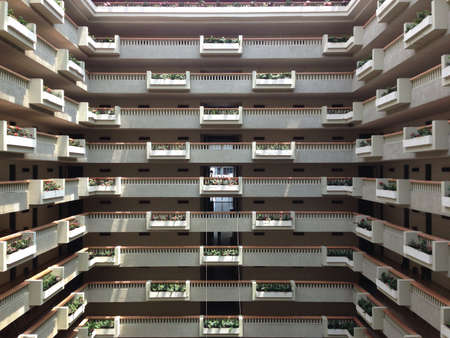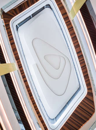 The beautiful bottom-up view in public building from ground floor to the roof. Some floors are furnished with wooden pattern but the roof is designed as spiral pattern instead.