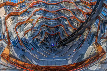 New York - October 10, 2019: The Vessel, looking down from the centre, the elaborate honeycomb like structure rises 16 stories, 154 flights of stairs and 2,500 steps and 80 landings for visitors to climb, in Hudson’s Yard, Manhatten.