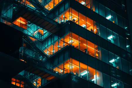 Modern office building illuminated at night, representing contemporary architecture and technology