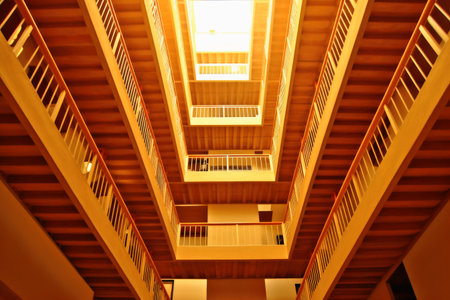 View from below into a high stairwell created with generative AI technology