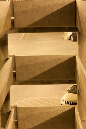 Modern building used as a covered parking garage with blue sky background. Urban city views in downtown Austin Texas with exterior of a multi level parking area.