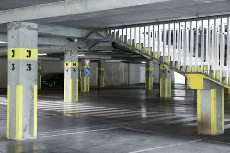 empty modern parking lot garage building in shopping mall because city lock down during coronavirus or covid-19 virus outbreak situation. transportation, coronavirus or city lockdown concepts