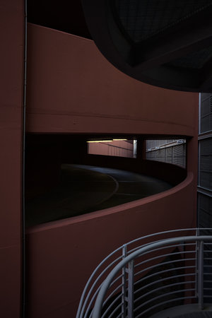 Spiral shaped ramp of a parking lot next to another building seen from a metallic staircase
