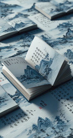 Books with ink wash style illustrations and Chinese calligraphy are arranged, showcasing a traditional artistic style. The composition includes details of pages in blue and white, with selective focus. This image could be used for educational, cultural, or artistic projects.