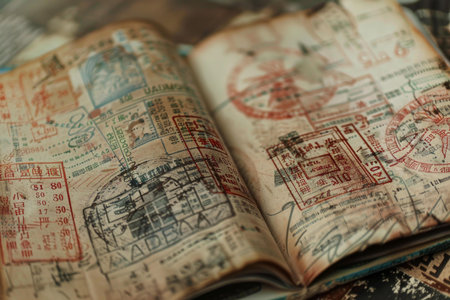 Open passport is laying open showing many colorful entry and exit stamps from various countries
