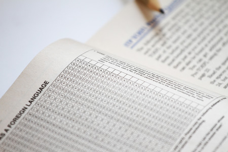 Answer sheet for test. English test choose the right answer. English grammar test sheet. Multiple choice test. Exam for students in school, college and university. USA or English Education concept
