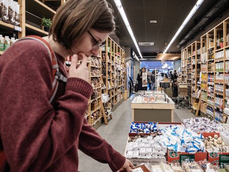 Barcelona, Spain - Nov 17, 2017: Indecisive woman choosing traditional Catalan sweets as souvenir in a local organic food store